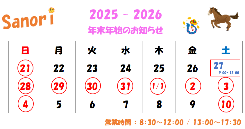 年末年始のお知らせ。 公開済み: 2025年12月10日更新: 2025年12月10日作成者: sanori お世話になっております、さのりです。 暮れてきましたねぇ ⛄️ まだ2025年を振り返るには早いけど、営業日のご案内は早い方が良いかと ✋️ では、ご確認ください。 この時期から話題 🎤 になるのは、 「 年越しは無事に過ごしたい ✨️ 」 ですね。 渋滞まで見越して、時間的ゆとりを持たせたタイムスケジュールを組む 🕑️ スピードを抑えて、車検距離を充分に採る等々、運転の安全を尽くしてくださいね 🚗 それでは、良い年末を 🎍 2025.12.10